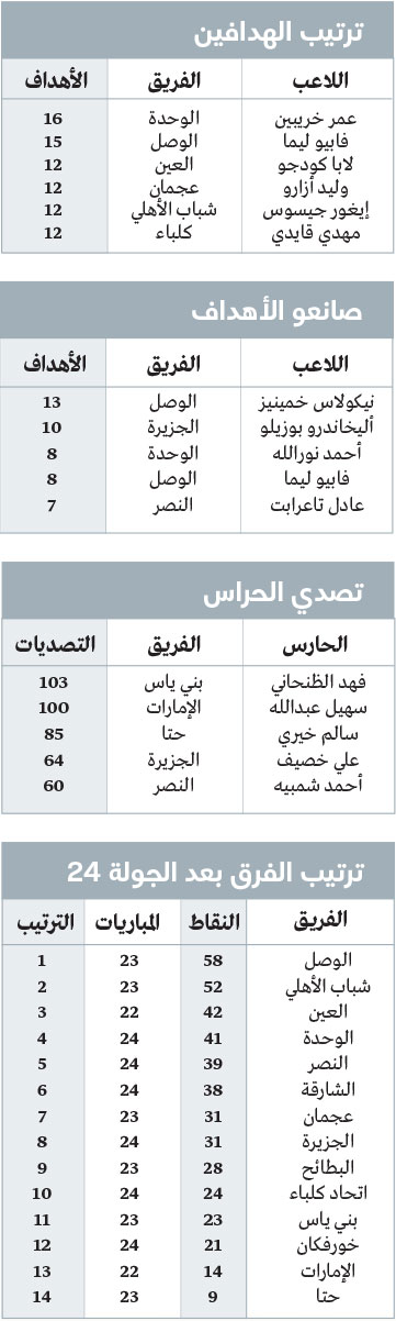 دخل دوري أدنوك للمحترفين صراع الأمتار الأخيرة، حيث شهدت الجولة 24 إثارة كبيرة جداً، على الرغم من أن نتائجها لم تحسم الصراع على اللقب، ولا هوية الفريق الذي سيرافق حتا إلى دوري الدرجة الأولى، لكنها في المقابل، رفعت مستوى الندية بشكل كبير، سواء بين الوصل المتصدر وشباب الأهلي، المتنافسين على لقب الدوري، أو بين الفرق المهددة بالهبوط في المراكز الأخيرة، وهو ما يظهر في ثمانية مشاهد لافتة في الجولة الماضية.