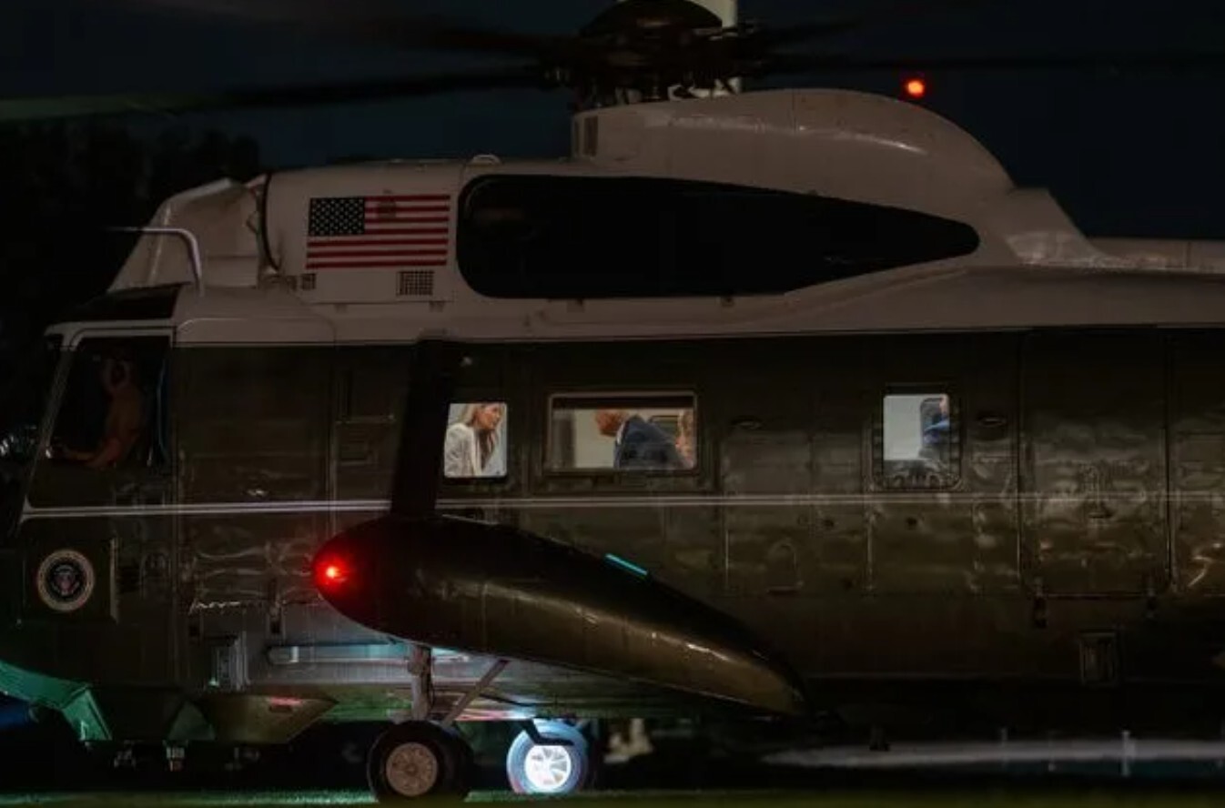 وبعد انتهاء المحادثة، خرج الزوجان من المروحية وسارا عبر العشب الجنوبي ممسكين بأيدي بعضهما، بينما كان الرئيس يلوح للصحفيين.